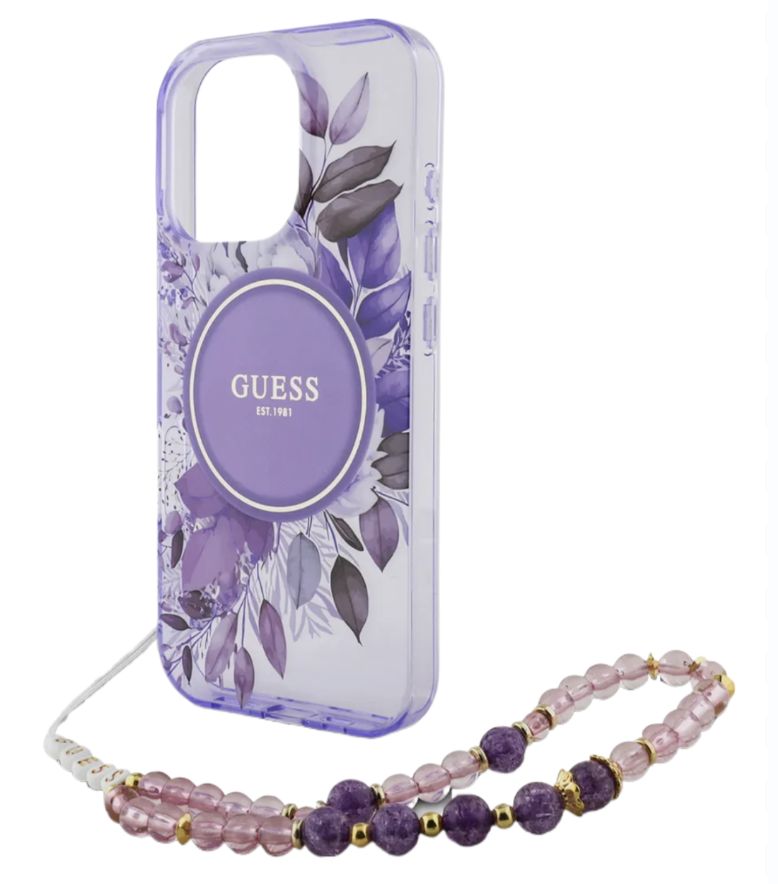 Чехол Guess MagSafe для iPhone 16 Pro Max с ремешком с цветами фиолетовый